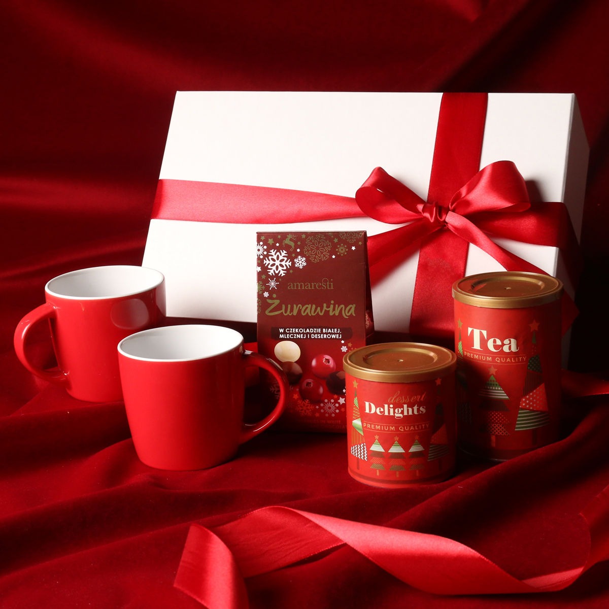 Kultowe kubki Handy w kolorze czerwonym Praliny żurawina w czekoladzie białej, mlecznej i gorzkiej Delikatne Delights Pralines - czarna porzeczka w białej czekoladzie w pudrze malinowym 80g Aromatyczna herbata zielona Sencha z wiśniami, płatkami róży i liśćmi ginko biloba 80g Ekskluzywne opakowanie zamykane na magnes z możliwością dodania pasującej wstążki i obwoluty